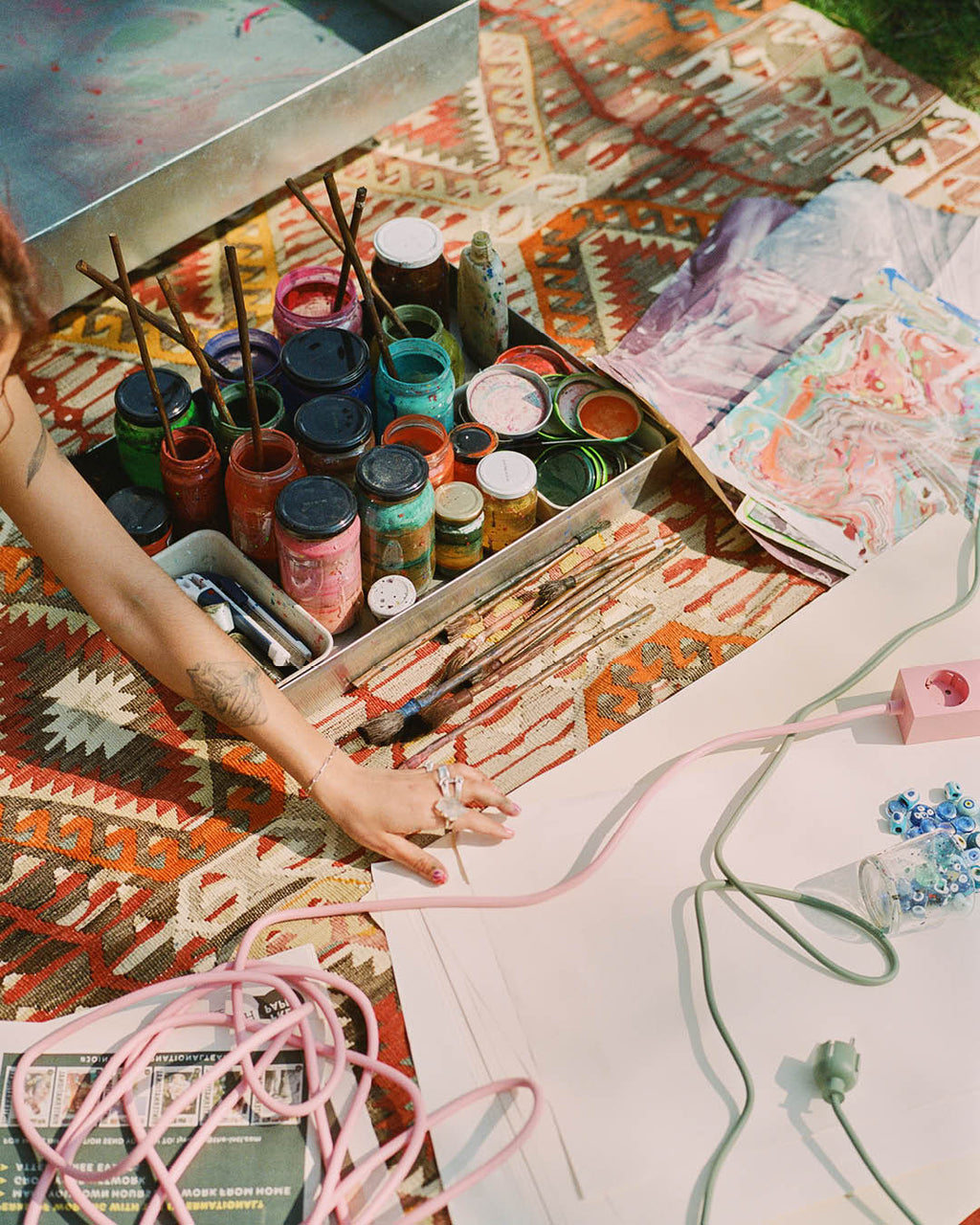 We spoke with Gökçe Tercioğlu, a Turkish-Irish artist based in Copenhagen who paints on water. Her work combines traditional techniques with a playful, expressive energy shaped by a life across eight countries – and 28 homes. For Gökçe, every object holds memory, and every brushstroke is personal. “My art is just… me,” she says. “It’s vibrant, it’s quirky – it’s everything I’ve lived.”