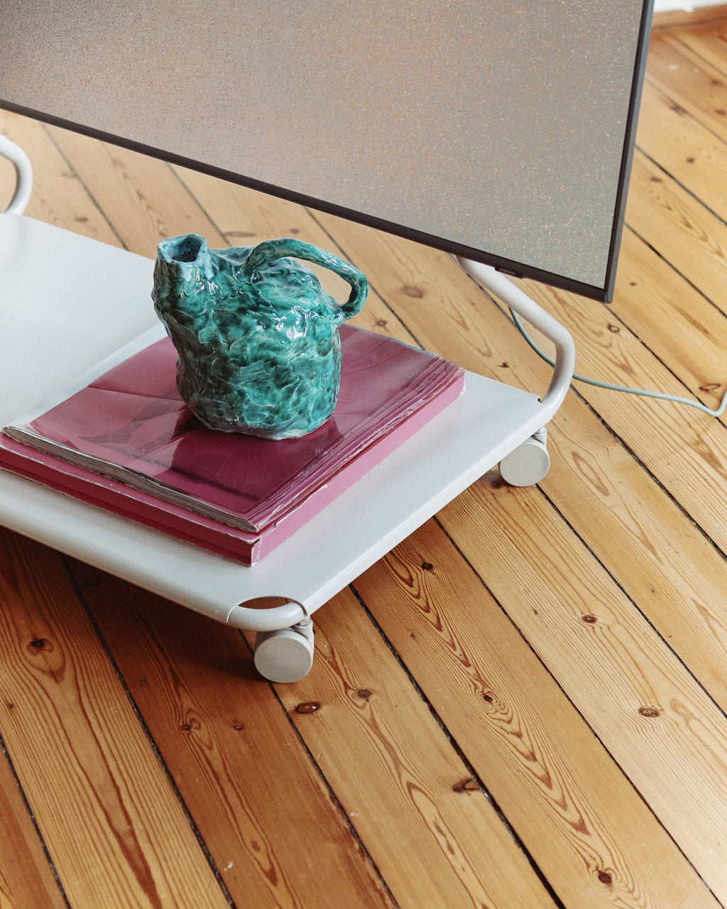 Disco kombinerer praktisk design med en karakteristisk silhuett – perfekt for avslappede oppsett eller rom med fokus på visning. Den lave høyden og brede basen gir et solid uttrykk, mens en lett bakovervinkling sikrer en komfortabel og naturlig visningsvinkel. En integrert, romslig hylle gir plass til medieenheter, bøker eller dekorative objekter – og forener oppbevaring og funksjon i en sømløs helhet.