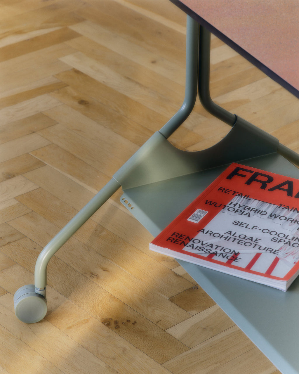 Pulverlakkert stålplate med satengfinish. Moon Rollin’ leveres med møbelhjul av høy kvalitet med myk PU-slitebane.